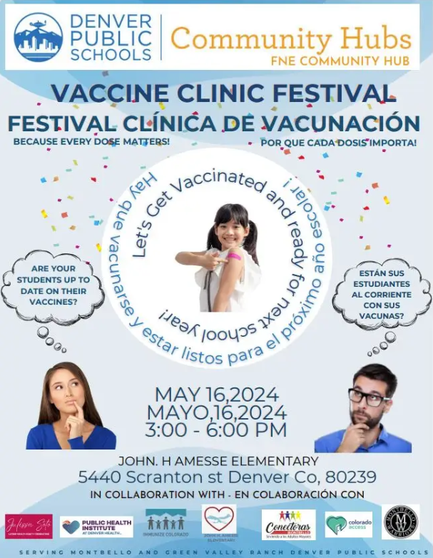 Scheduled for May 16, 2024, from 3:00 PM to 6:00 PM at John H Amesse Elementary located at 5440 Scranton St, Denver, CO 80239, the festival promises an engaging experience for families. Beyond receiving vaccinations, attendees can immerse themselves in the festivities while ensuring their children are prepared for the upcoming school year.