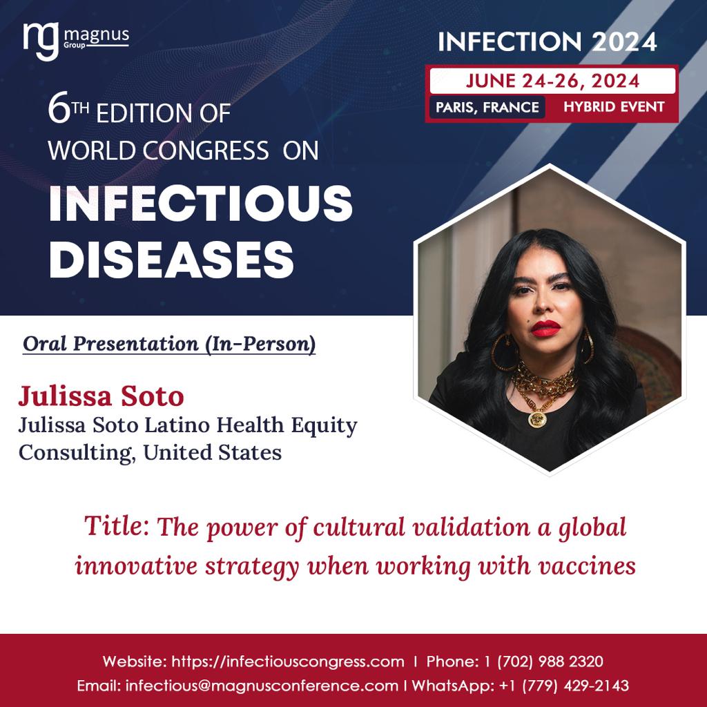 As we eagerly anticipate Julissa Soto's keynote address at the 6th World Congress on Infectious Diseases, let us heed her call for a more inclusive, culturally sensitive approach to vaccination. Together, guided by her insights and inspired by the spirit of collaboration that defines this congress, we can forge a path towards a healthier, more resilient future for all. Paris awaits, and with it, the promise of transformative change in the fight against infectious diseases.